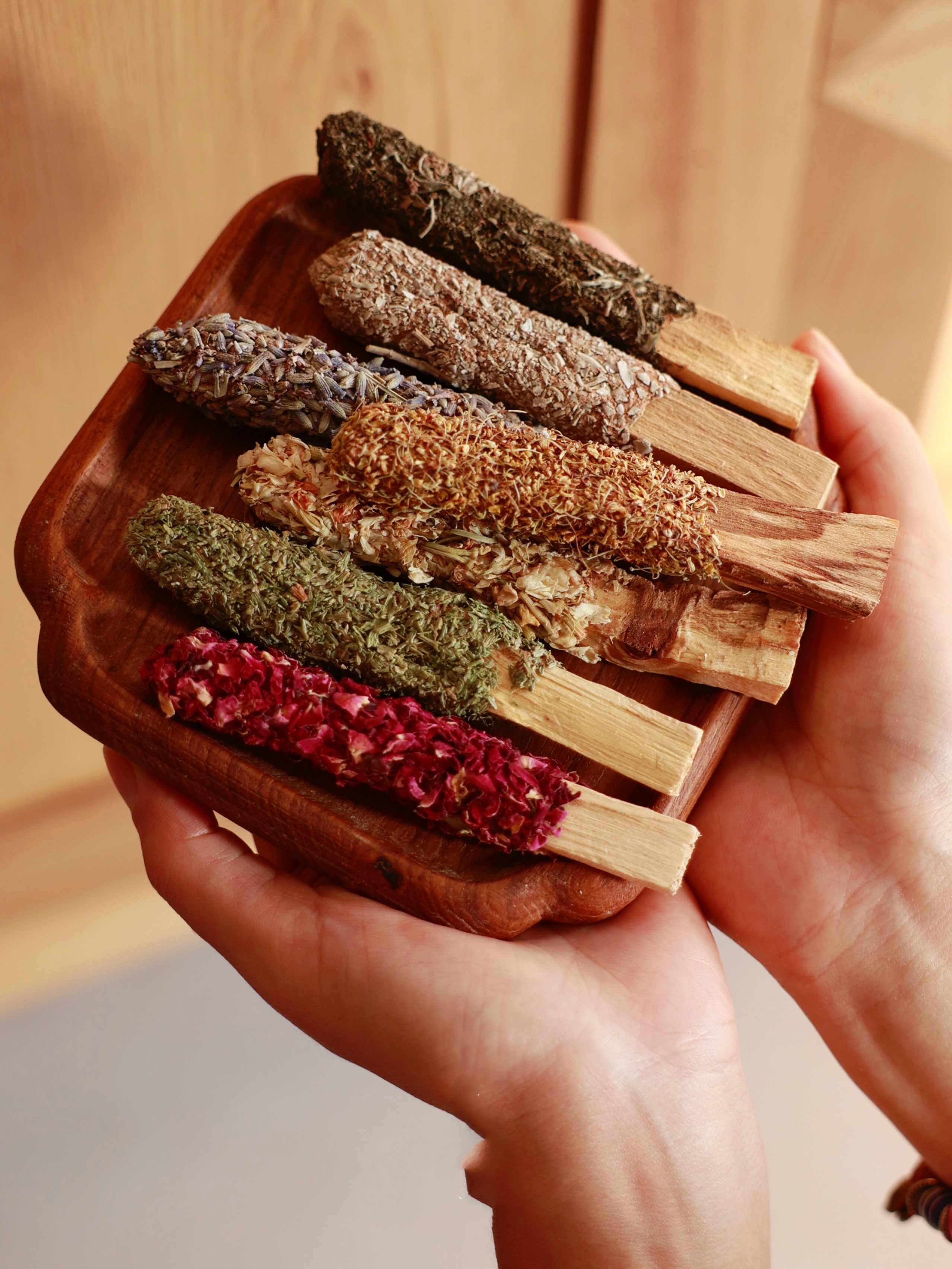 Close-up of customizable Floral Palo Santo sticks showing various dried botanicals for a unique sleep gift